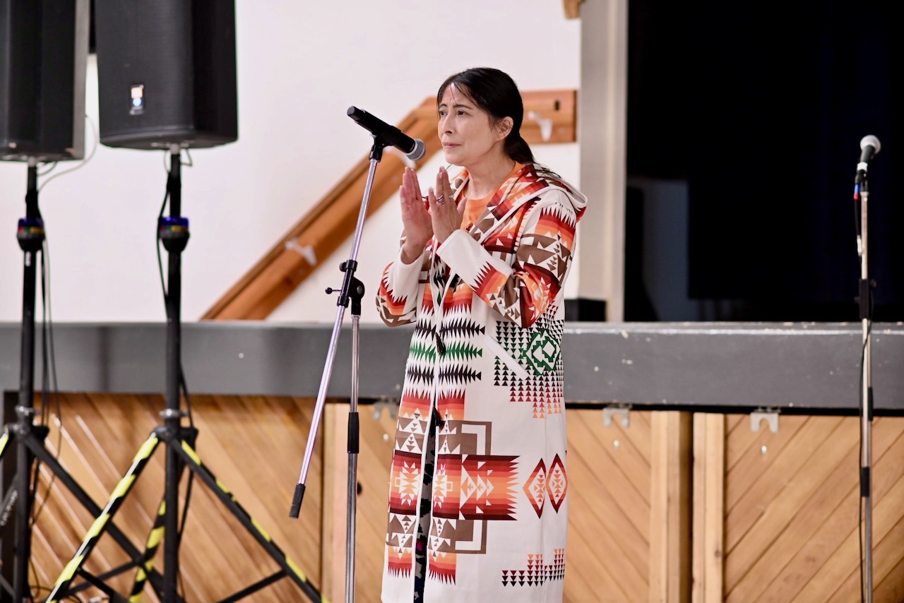 Shelley Calliou, a researcher and cultural advisor with the Kelly Lake Cree Nation, spoke to those gathered about the idea of Wahkotowin, a central Cree concept meaning kinship, relatedness, or the interconnectedness of all things.