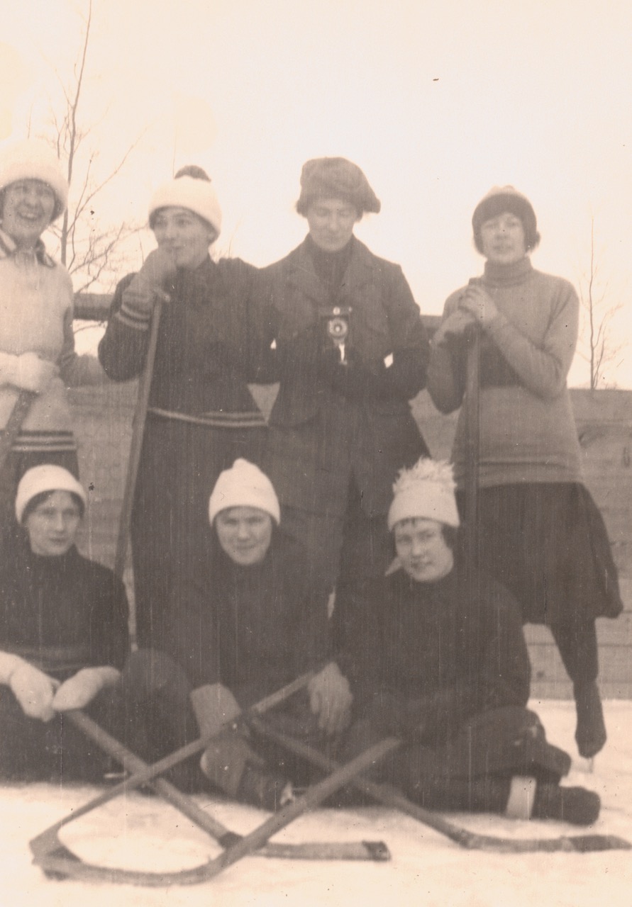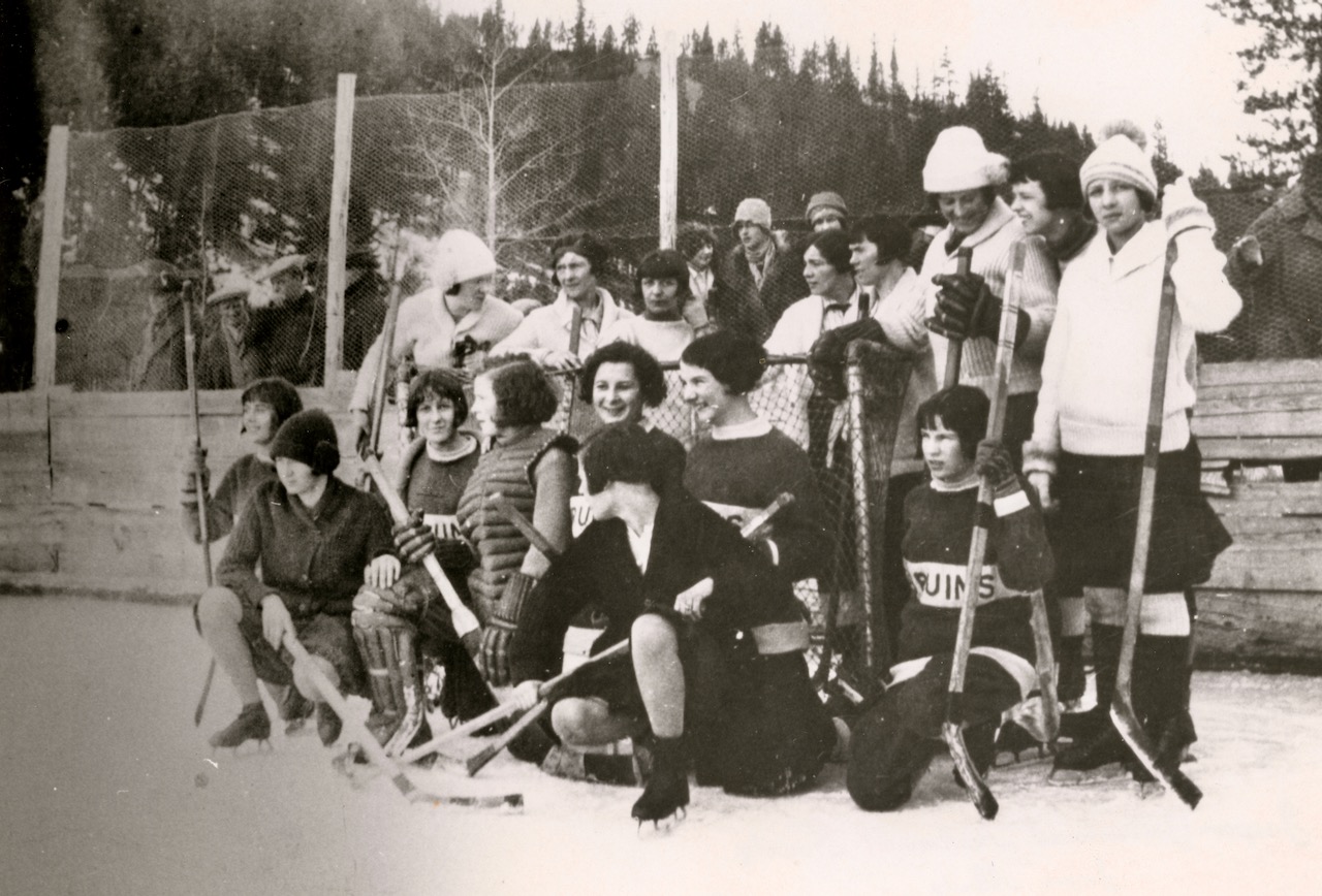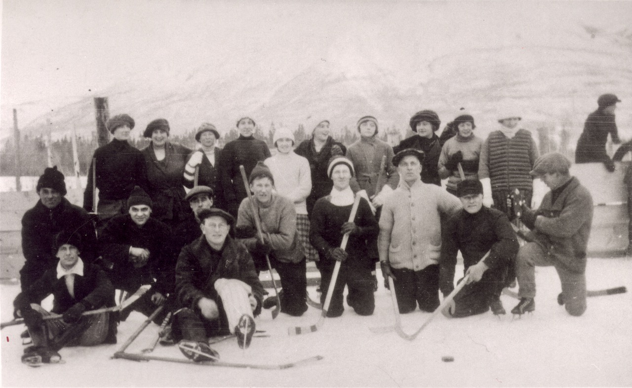 The first images of people skating on Jasper’s lakes were taken a century ago. In the early 1920s, groups of women and men, dressed rather formally, were photographed gliding across the ice, or posing for pictures with our familiar mountains in the background. From 1924 and ’25, photos of Jasper’s first hockey teams appear—both men’s (boys) and women’s (ladies) teams, some associated with the high school, all looking flushed, fresh from an outdoor skate.