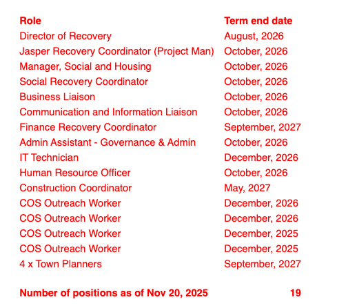 Positions created to facilitate Jasper’s recovery from the 2024 wildfire will be fully funded to the end of their respective terms.