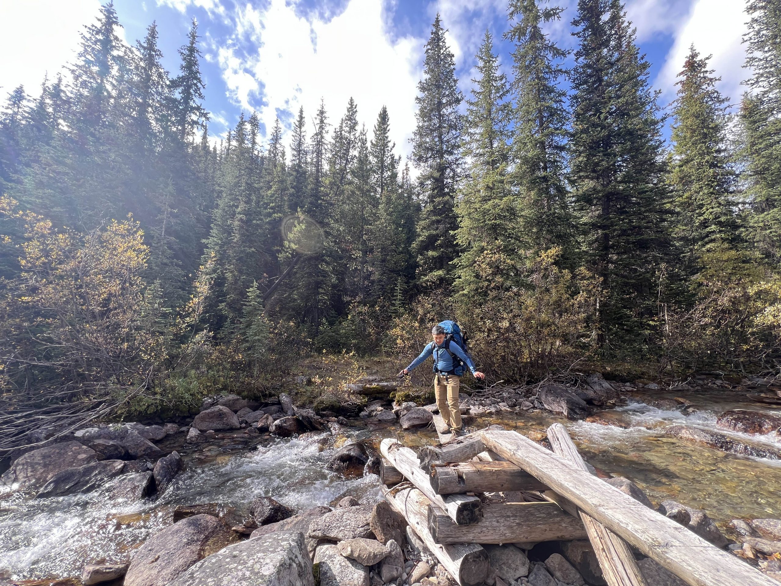 At the turn-off for Maligne Pass the sign said Unmaintained Trail. To Avalanche camp, our next gourmet stop, we crossed Poligne Creek seven times in five kilometres. Sometimes boulder hopping, sometimes risking rotten titling wobbly planks. I even tried riding a tree trunk to get across. We were following a route that years ago, corporate visionaries figured to build a road from Maligne Lake to Highway 93.