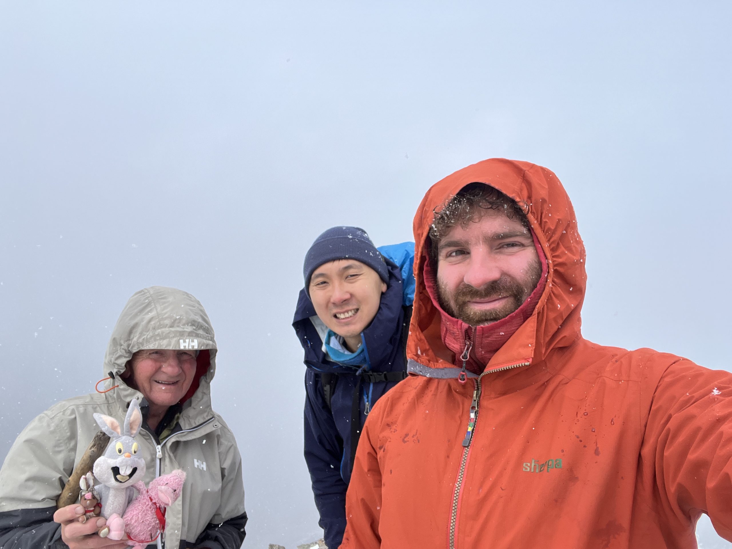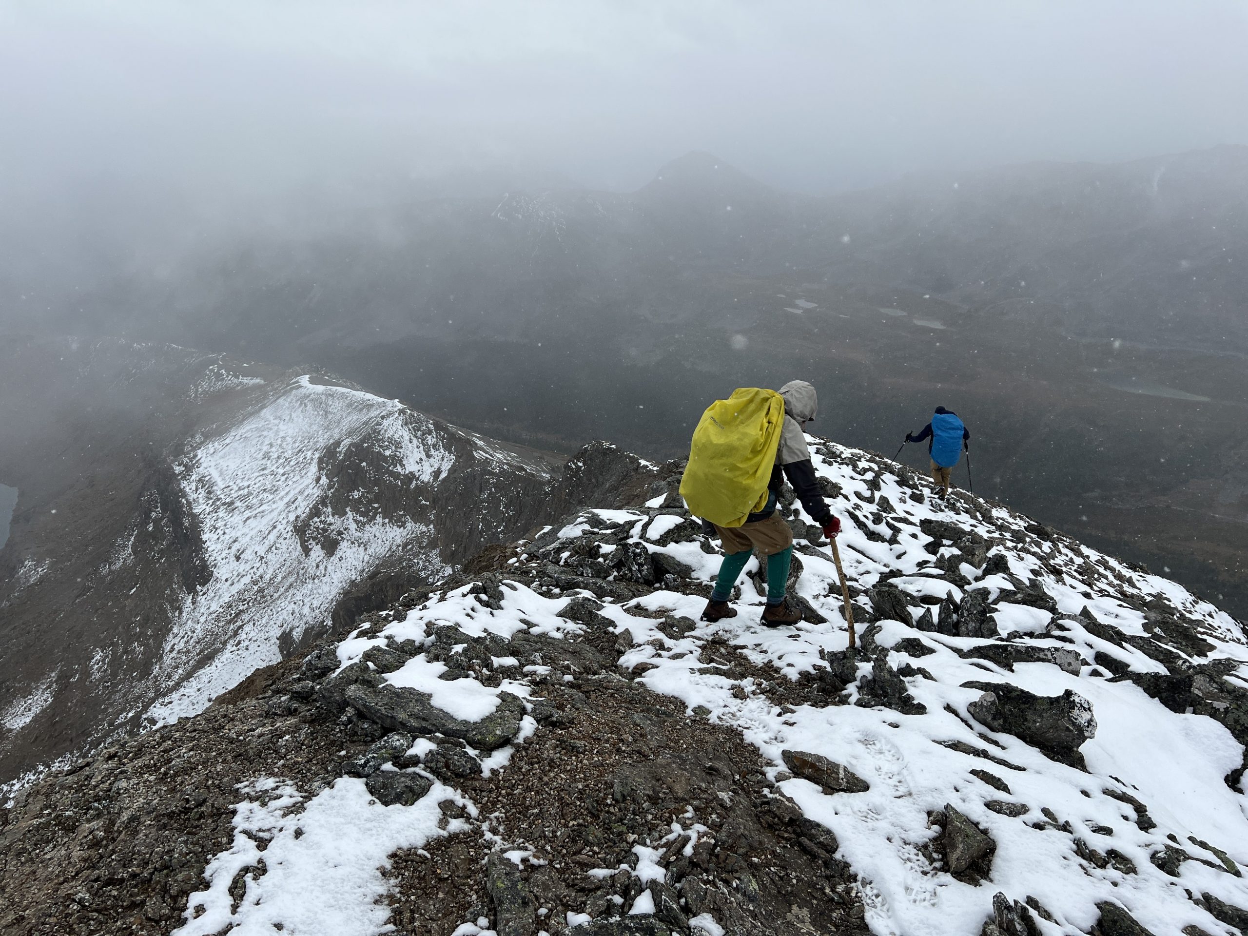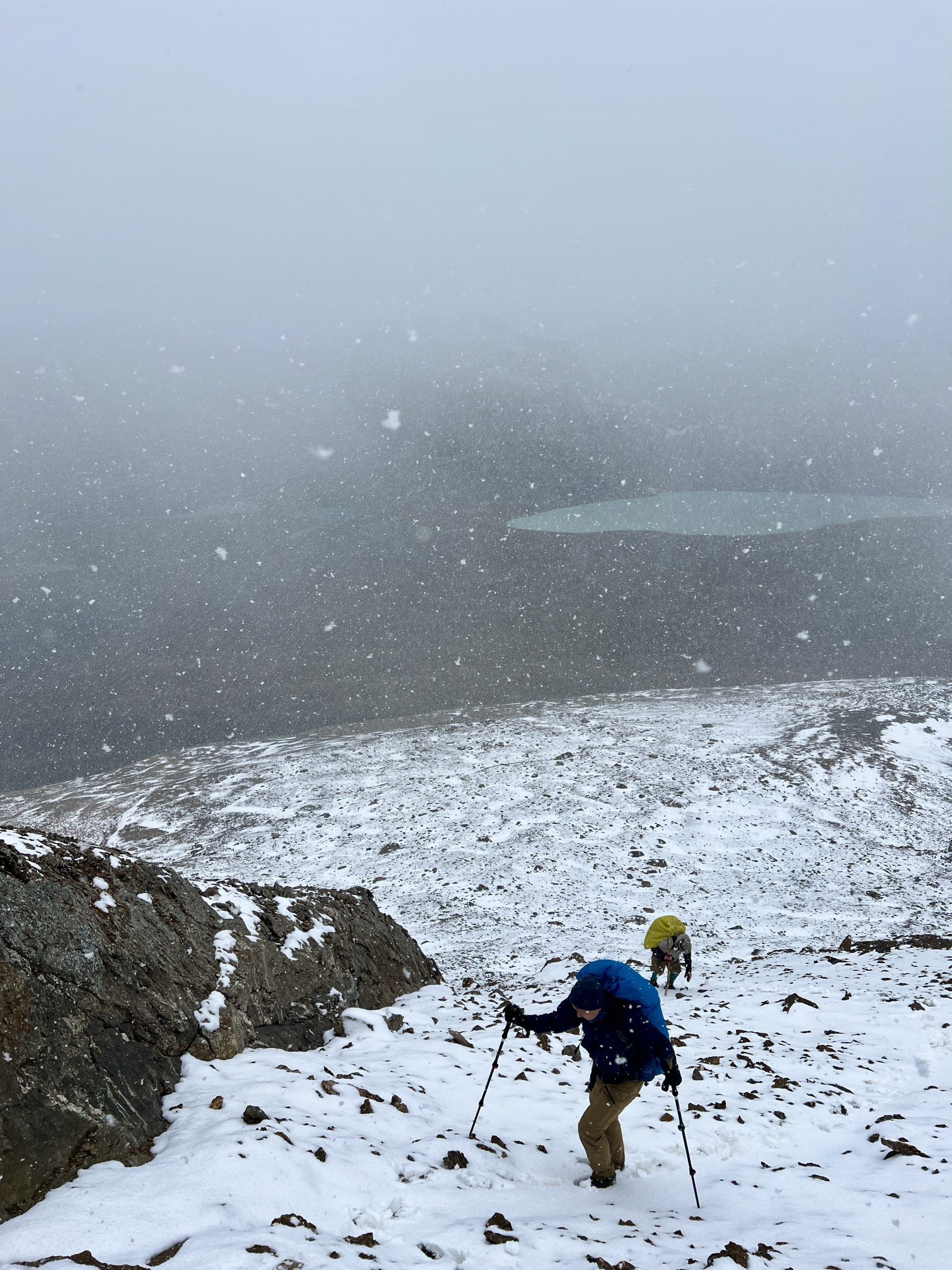 It was a steep climb through wet trees and bushes. I was soaked and shivering, and when we hit the ridge the snow started and the wind picked up.