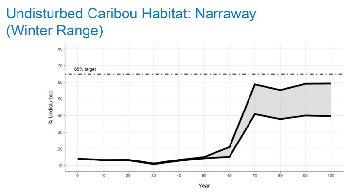 The Narraway herd range (half the planning area) sits at 15 percent undisturbed habitat today… but won’t even start improving for at least 50 years, and will never actually get to that magic 65 percent mark. Why the 50 year flat line? Because as the province rehabilitates old disturbances, they intend to keep cutting new ones. I think this strategy bears more than a passing resemblance to Alberta’s pledge to get to carbon neutrality by 2050, or to cleaning up orphaned oil wells by 2040: each of them have the baked-in philosophy of putting off important environmental issues for the foreseeable political future.