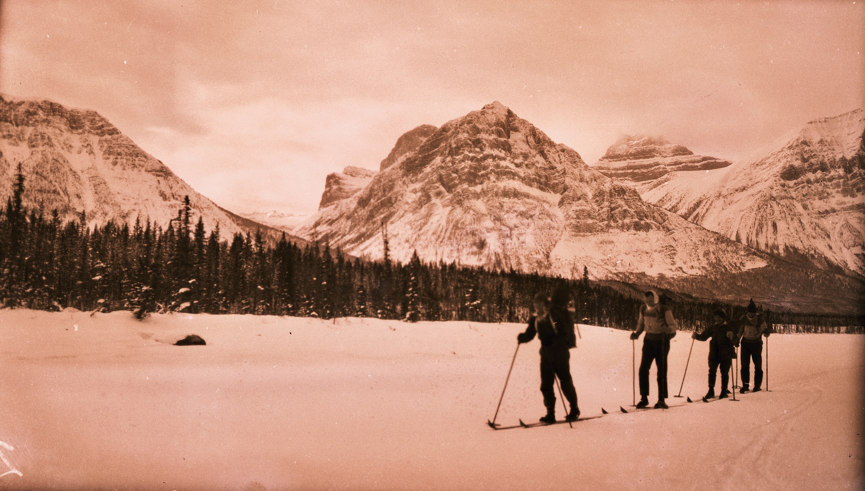Of course, these weren’t the first travelers to complete the route. Indigenous guides for Mary Warren Schäeffer knew well the passes and trails that connected the Bow and Athabasca valleys. Doug and Vern Jeffery, Peter Withers and Frank Burstrom photographed their ski trek from Banff to Jasper in 1930. And before the highway was completed in 1940, impatient parkway poachers were making their way along the route by car, horseback, and foot, as work was ongoing. Fred Brewster, writing about the “Columbia Icefield Highway”, reflected on the thousand years of travel along this route while excitedly introducing the world to the experience of viewing Jasper’s “glistening mountains” from their cars.